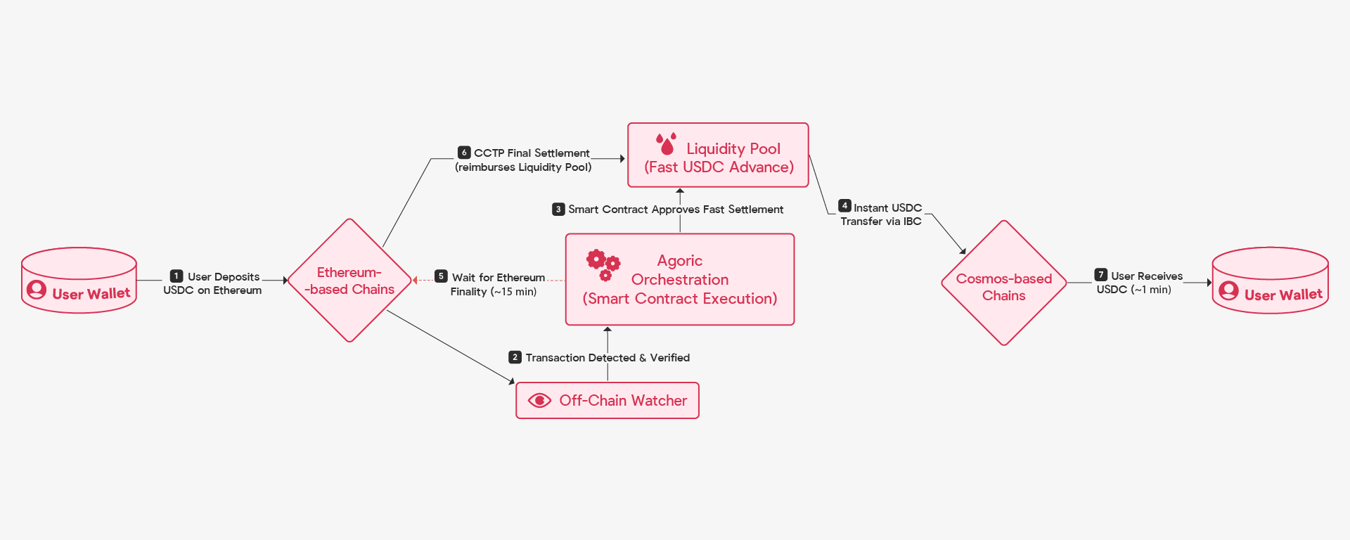 One flagship example of these concepts is Fast USDC, which transforms the user experience of moving USDC stablecoins from Ethereum (and other chains) into Cosmos. Traditionally, bridging USDC from an Ethereum chain into Cosmos takes about 16 to 20 minutes for finality. In the meantime, users get distracted, opportunities vanish, and payments stall. Fast USDC, powered by Agoric Orchestration, cuts that wait to under 1 minute, an ~18× speedup, by automating the process end-to-end.